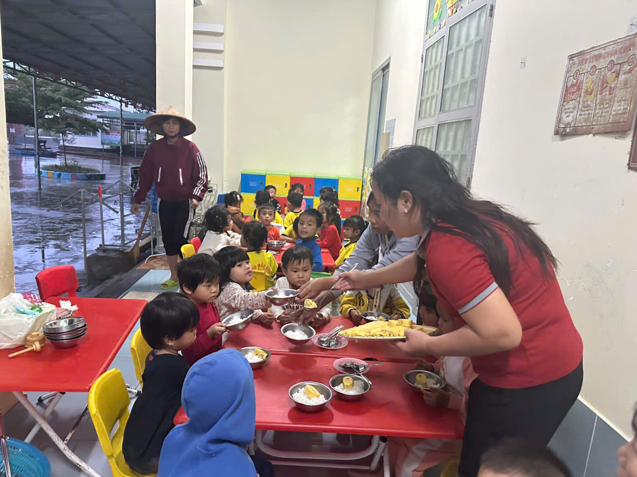 Từ ngày 18/11/2025, nhà trường đã quyết định giữ các cháu lại, tổ chức ăn nghỉ ngay tại trường – nơi tạm thời trở thành “ngôi nhà an toàn” giữa mùa lũ.