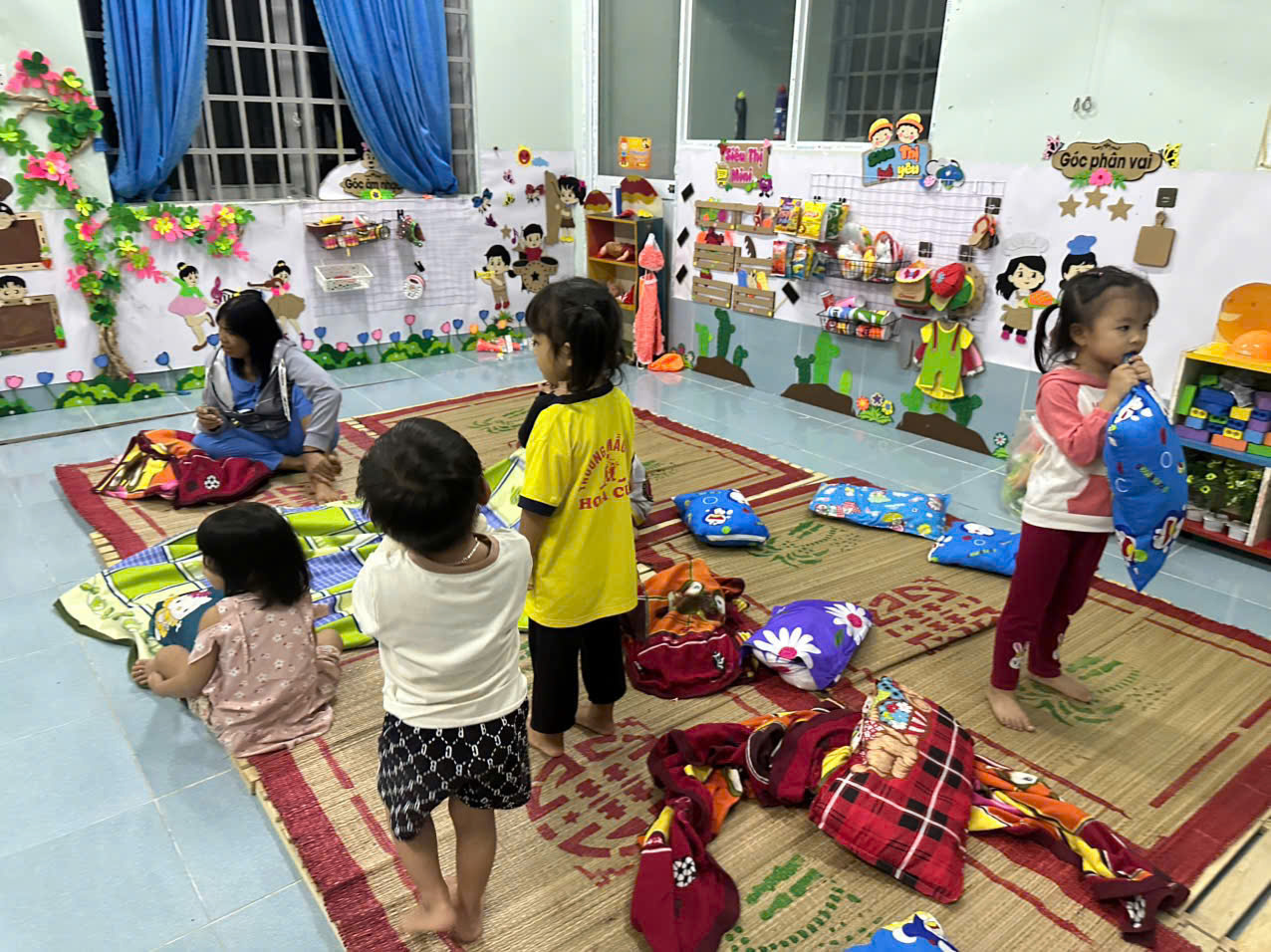 Nhà trường đã chủ động chuẩn bị chỗ ngủ, suất ăn, chăn màn và chăm sóc chu đáo cho các cháu, bảo đảm đầy đủ và an tâm nhất có thể.
