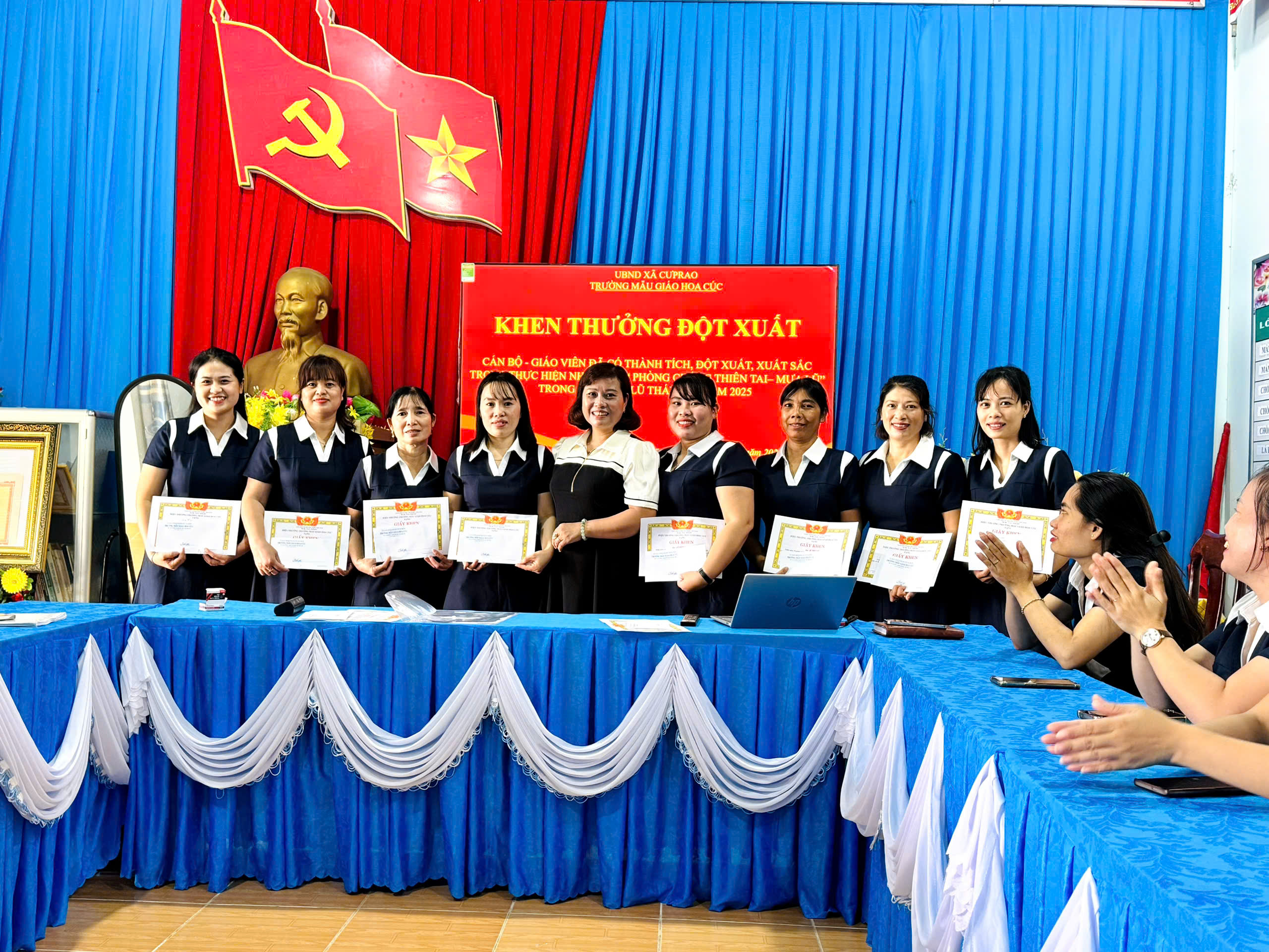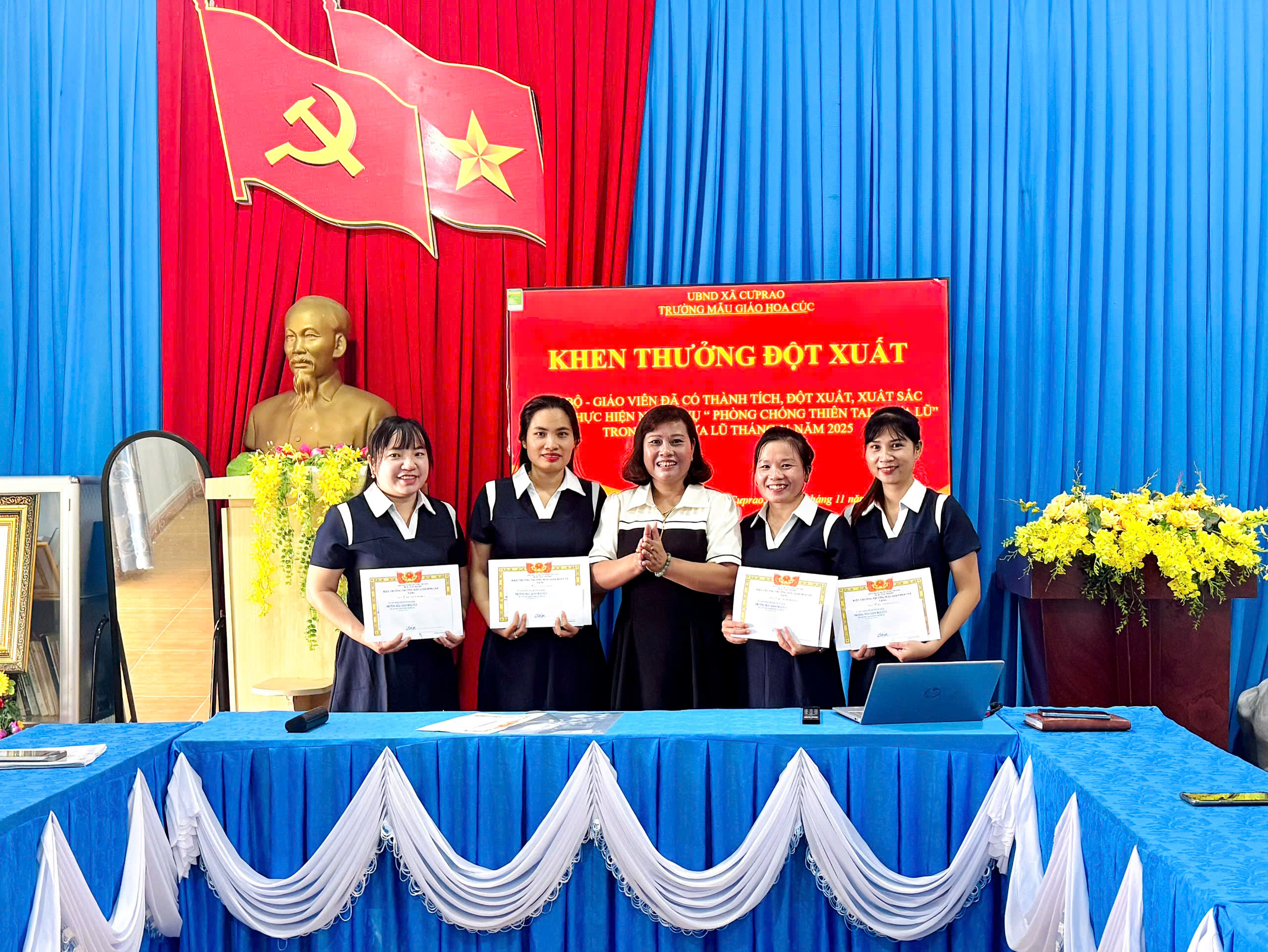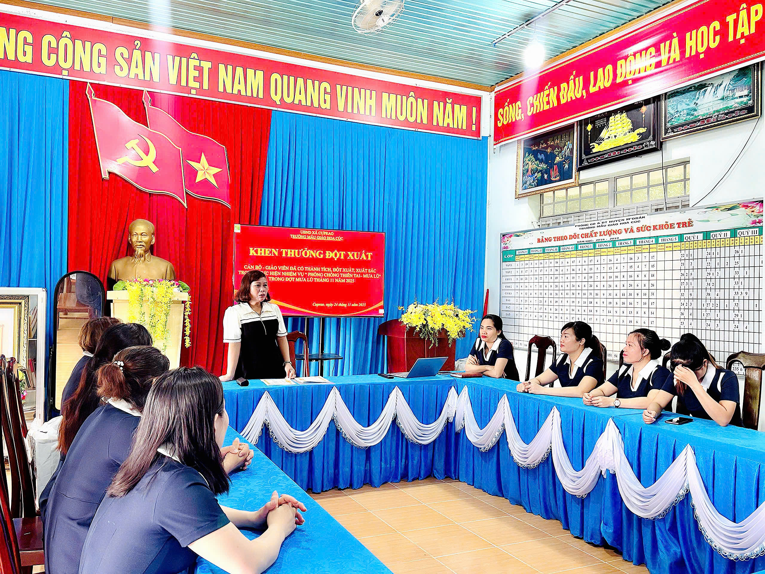 Trong thời điểm bão lũ diễn biến phức tạp, khi cô và trẻ phải ở lại trường để bảo đảm an toàn, tập thể cán bộ, giáo viên đã thể hiện tinh thần trách nhiệm cao, sự bình tĩnh và tấm lòng tận tụy đối với nghề. Mặc dù điều kiện còn nhiều thiếu thốn, các cô vẫn không quản khó khăn, luôn kề cận, chăm sóc, động viên từng trẻ, bảo đảm cho các cháu có cảm giác an toàn, ấm áp và yên tâm trong suốt thời gian lưu trú tại trường. Sự hy sinh thầm lặng, tinh thần đoàn kết và nỗ lực hết mình của đội ngũ giáo viên đã góp phần bảo vệ an toàn tuyệt đối cho trẻ, giảm thiểu mọi rủi ro trong thiên tai. Ghi nhận những đóng góp đầy ý nghĩa đó, đồng chí Hiệu trưởng đã trân trọng khen tặng giấy khen cho tập thể giáo viên – như một sự biểu dương, tri ân và khẳng định giá trị tinh thần cống hiến vì học sinh thân yêu.